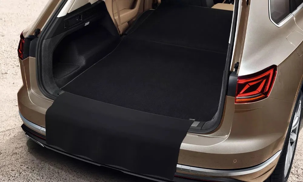 For 2019 on models. Original Volkswagen reversible trunk mat with trunk sill protection - For variable loading floor, upper position - With folding trunk sill protection - Tailor-made - Reversible - Top: velour, bottom: plastic nubs - Prevents the load from sliding - Protects the bumper from damage